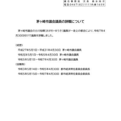 4月末日をもって同期の小川議員が退職されたことが議会から発表となりました。