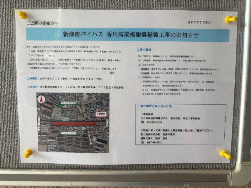8月から「新湘南バイパス 香川高架橋」の耐震補強工事が始まります。この工事は、大地震に備えて橋を支える柱を補強する重要なものです。