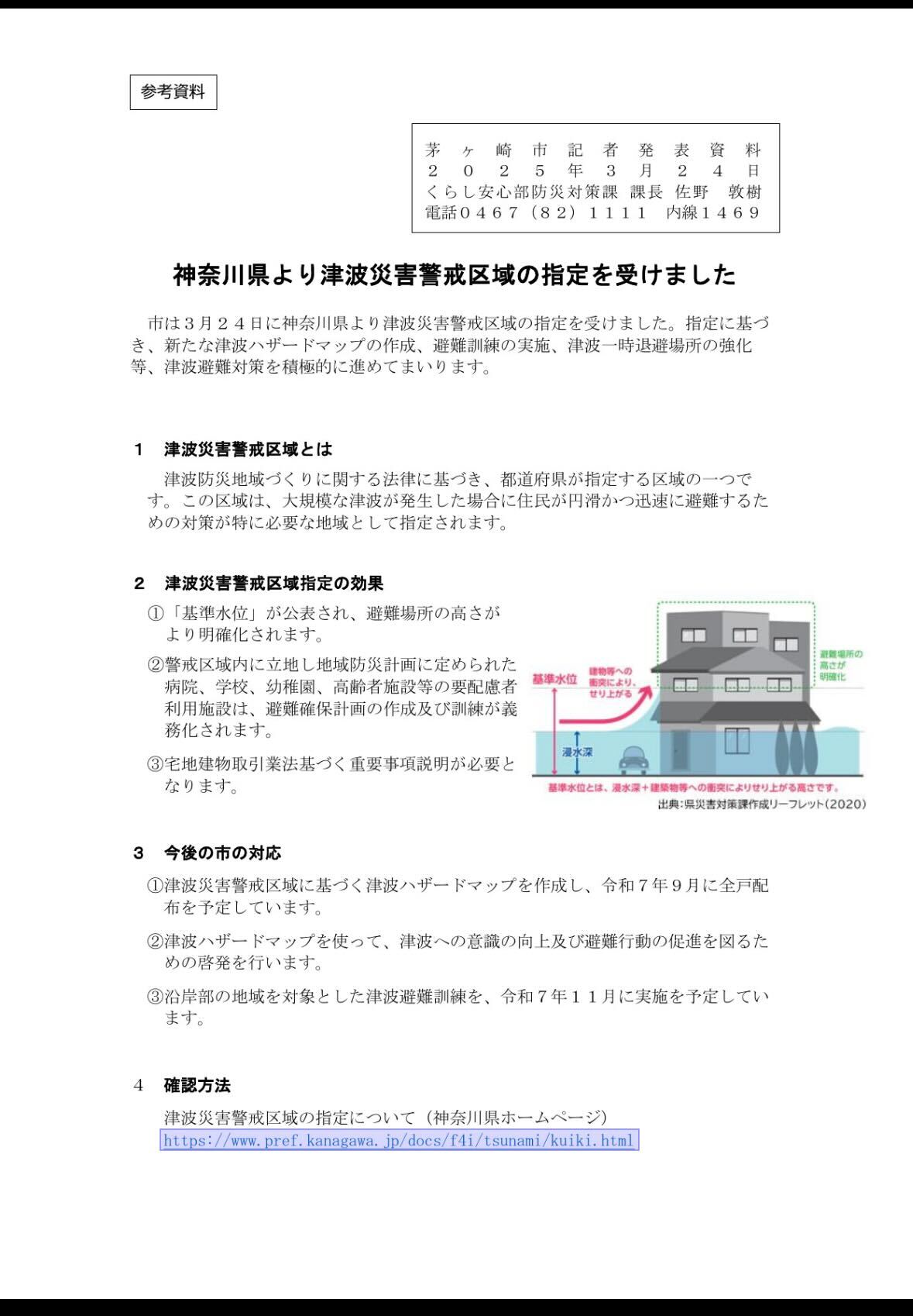本年3月24日、茅ヶ崎市は神奈川県より「津波災害警戒区域」の指定を受けました。