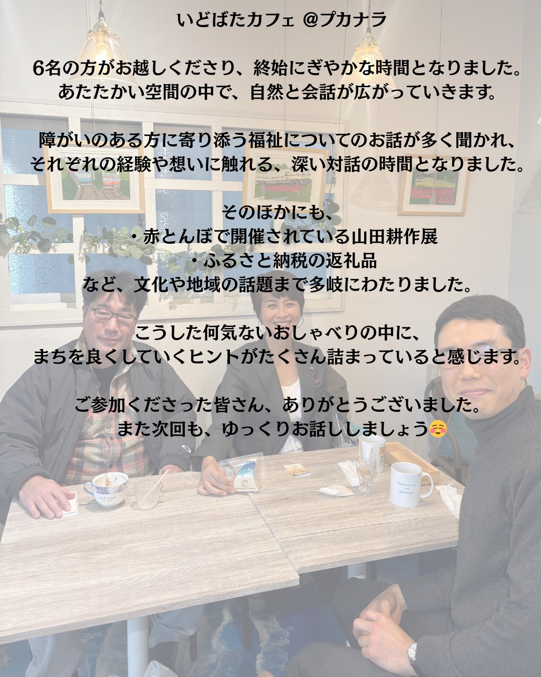 障がいのある方に寄り添う福祉についてのお話が多く聞かれ、 それぞれの経験や想いに触れる、深い対話の時間となりました。